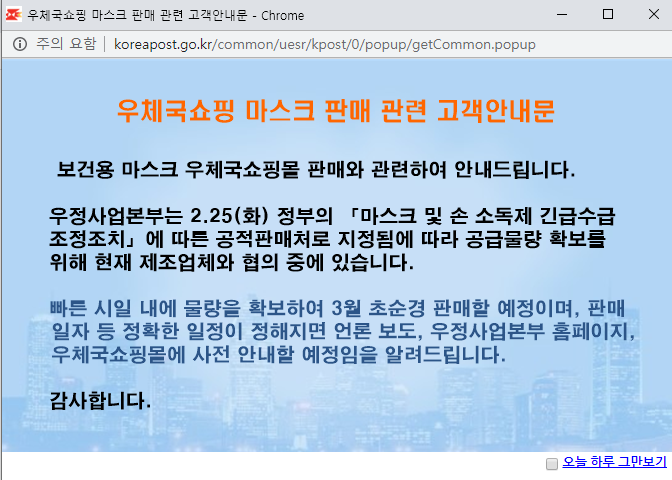 우체국 쇼핑 홈페이지에서 마스크 판매한다는 소식을 전하자 홈페이지가 먹통이다.