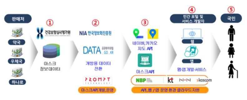 * 클라우드 기업별 역할 : 약국정보, 마스크재고 등 데이터API서버 제공 (네이버클라우드), 개발언어, DBMS(데이터관리시스템), WAS(웹서버) 등 개발환경 제공(KT, NHN, 코스콤)