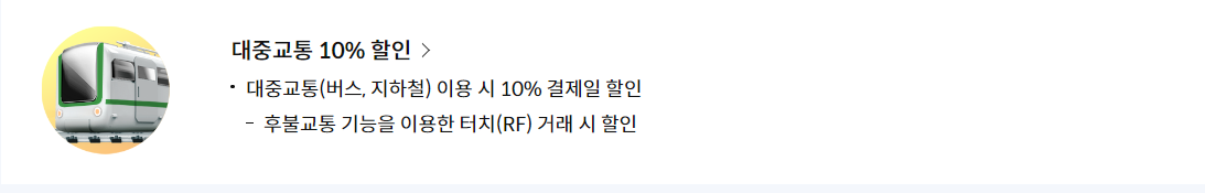 대중교통(버스, 지하철) 이용 시 10% 결제일 할인