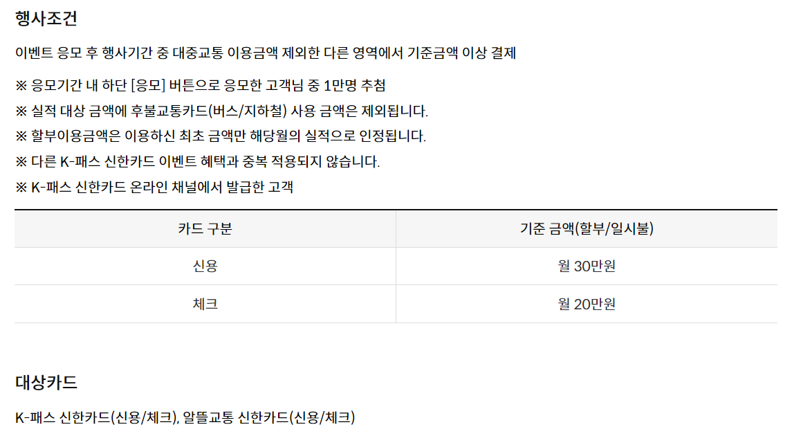 - K-패스 신한카드 유효기간 만기 또는 해지 후 재발급 시 최초 신규 발급 회원에서 제외됩니다.