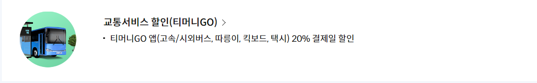 고속/시외 버스, 따릉이, 킥보드, 택시 20% 결제일 할인