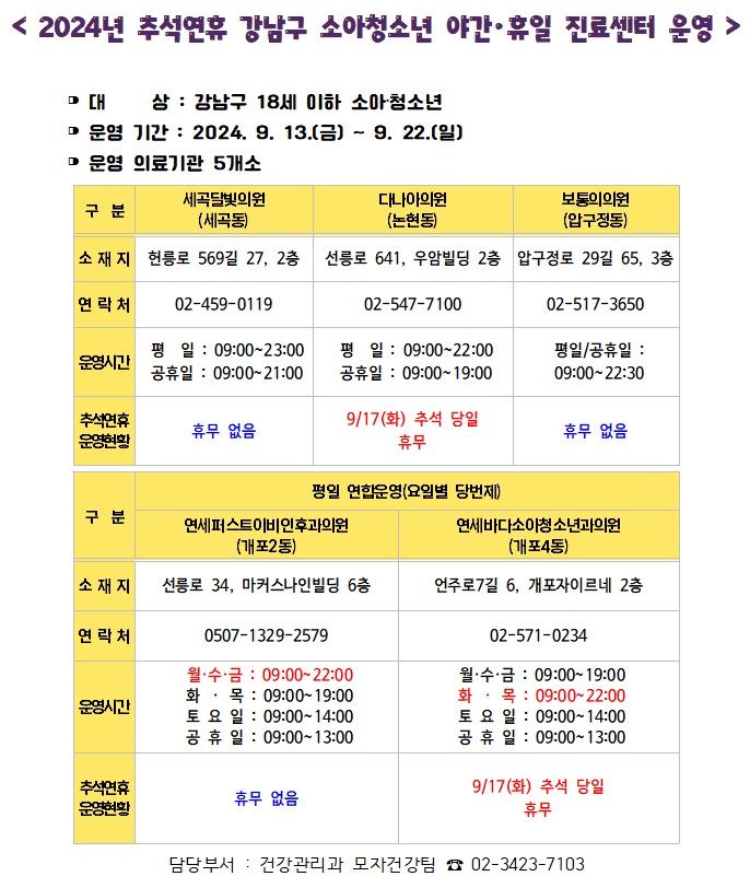 9. 13.(금) ~ 9. 22.(일), 10일간소아청소년 야간·휴일 진료센터 5개소