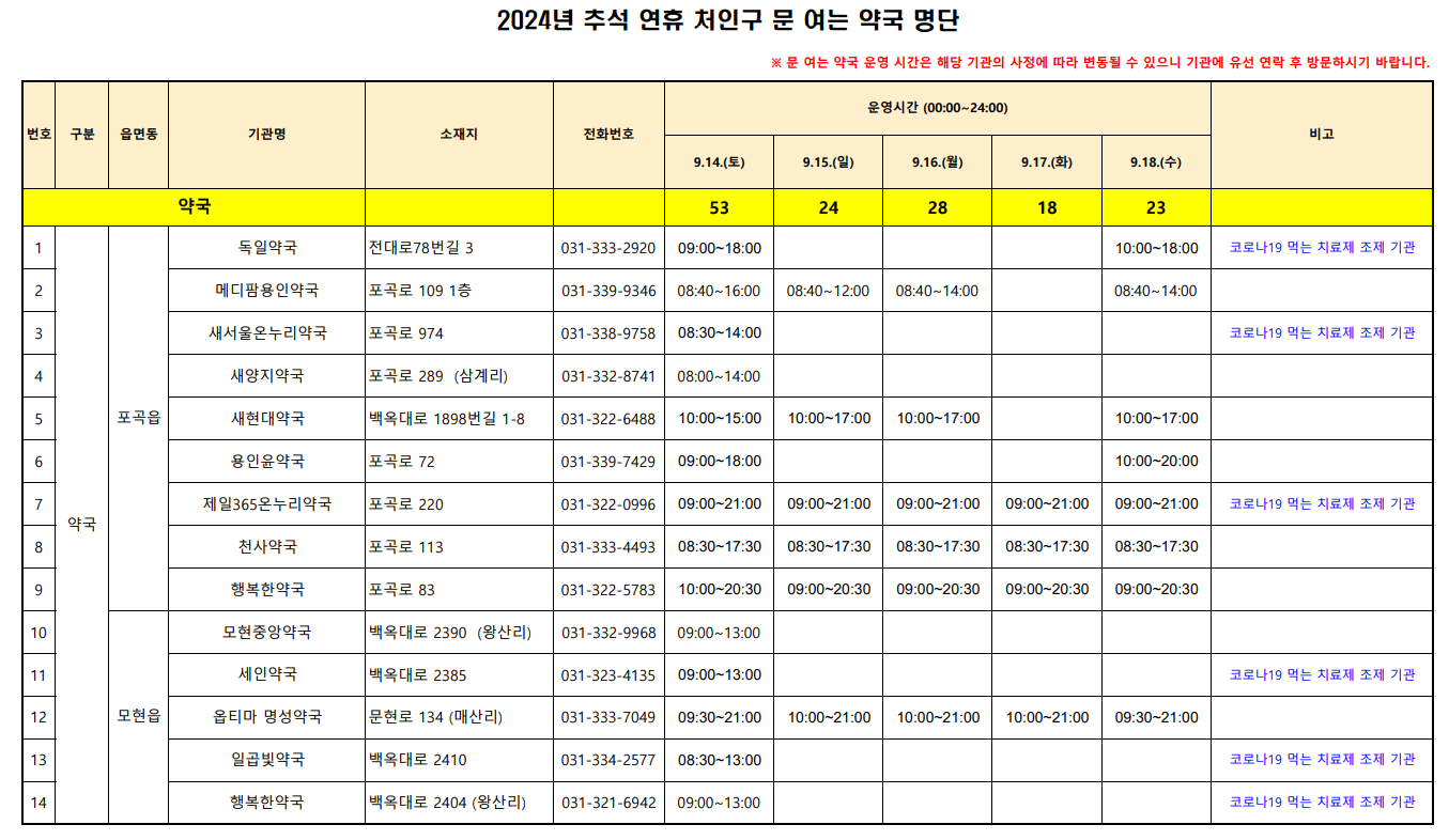 2. 추석 연휴에 문여는 용인시 처인구 약국 (☞스마트폰 가로보기 추천)