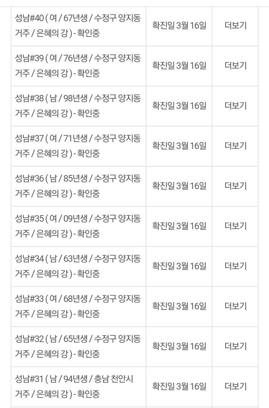 이로써 지난 3월 9일 교회 내 첫 번째 확진자(87년생 남성, 광진구 관리 확진자)발생 이래 3월 16일 오전 7시 현재 은혜의 강 교회 내 확진자는 총 46명입니다.