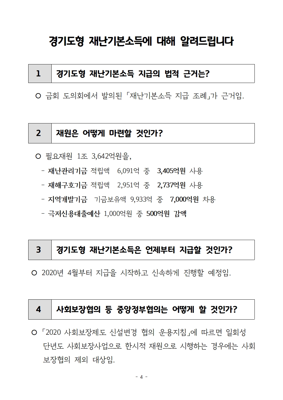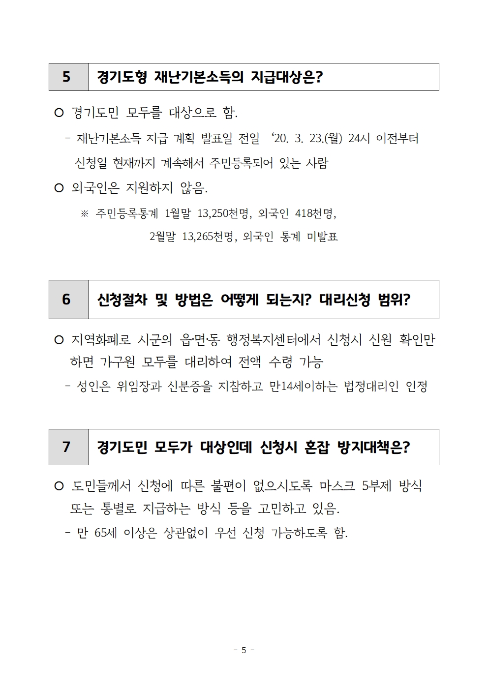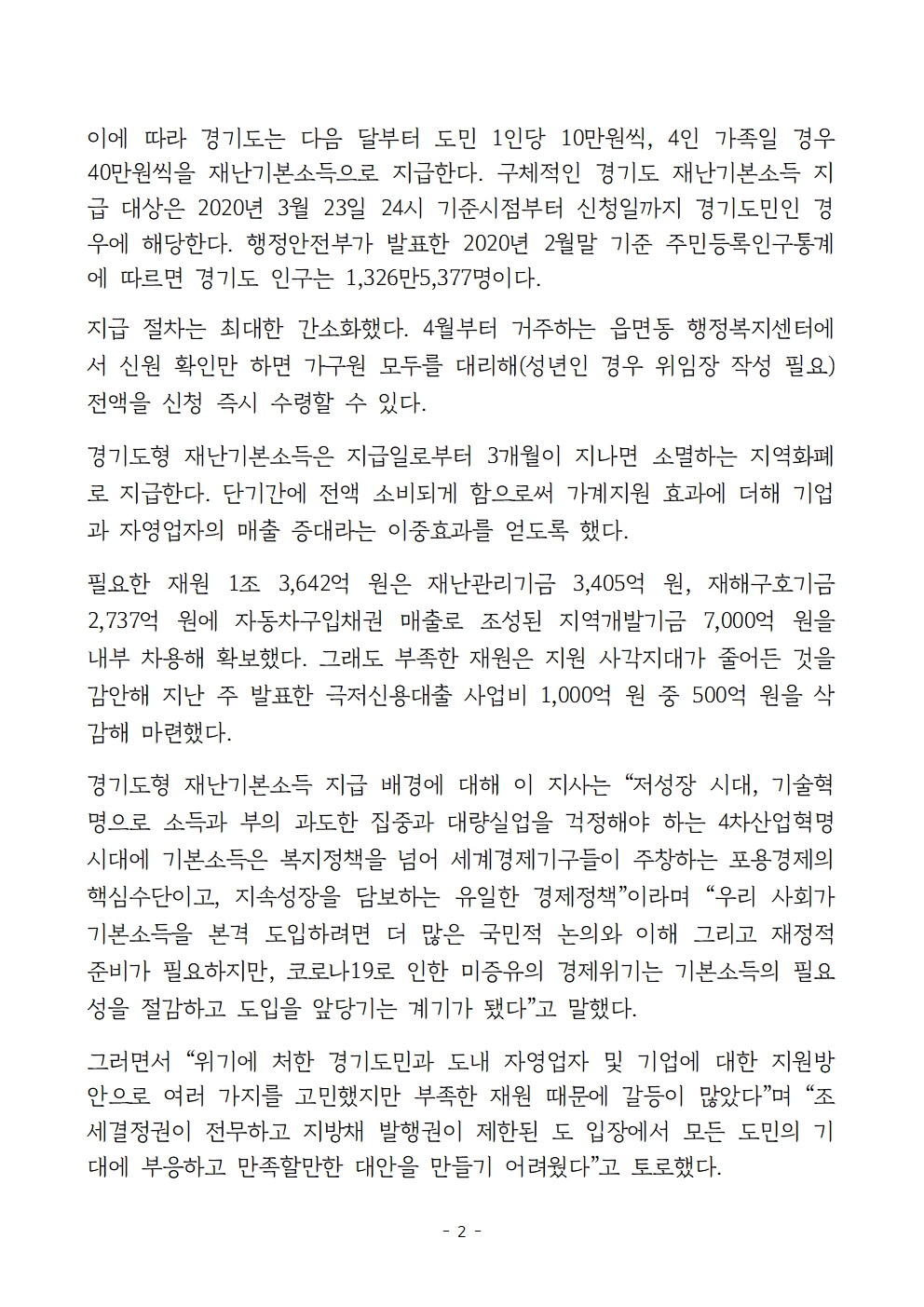이에 따라 경기도는 다음 달부터 도민 1인당 10만원씩, 4인 가족일 경우 40만원씩을 재난기본소득으로 지급한다. 구체적인 경기도 재난기본소득 지급 대상은 2020년 3월 23일 24시 기준시점부터 신청일까지 경기도민인 경우에 해당한다. 행정안전부가 발표한 2020년 2월말 기준 주민등록인구통계에 따르면 경기도 인구는 1,326만5,377명이다.