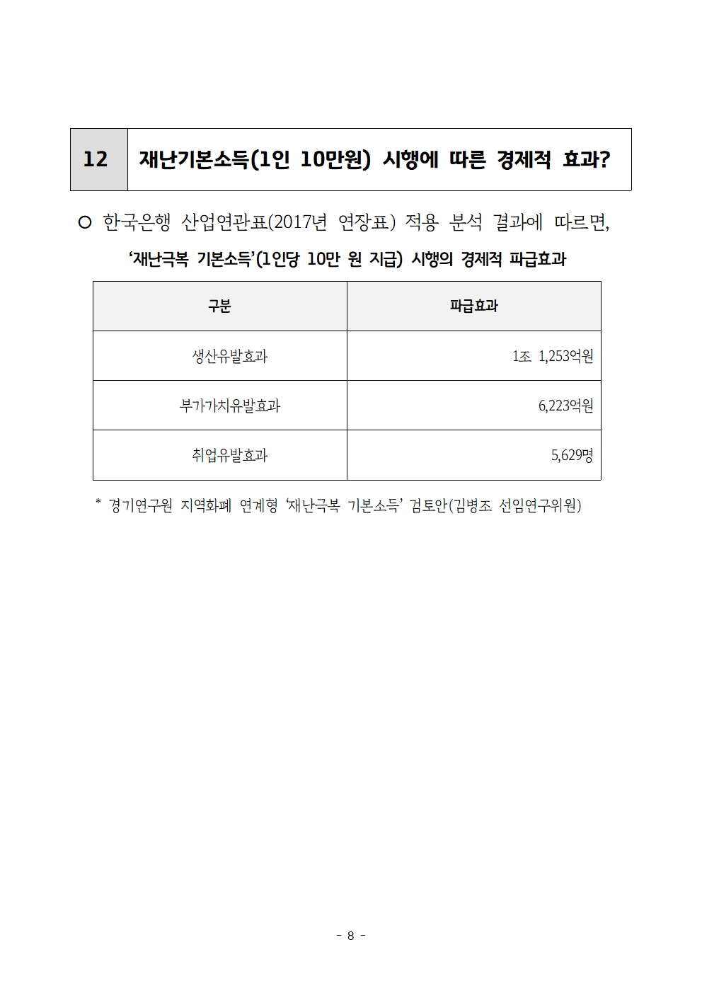 한편, 경기연구원이 한국은행 산업연관표(2017년 연장표)를 적용해 1인당 10만원씩 재난기본소득을 시행했을 때 발생하는 경제적 파급효과를 분석한 자료에 따르면 생산유발효과는 1조 1,235억원, 부가가치유발효과는 6,223억원, 취업유발효과는 5,629억원으로 조사됐다.
