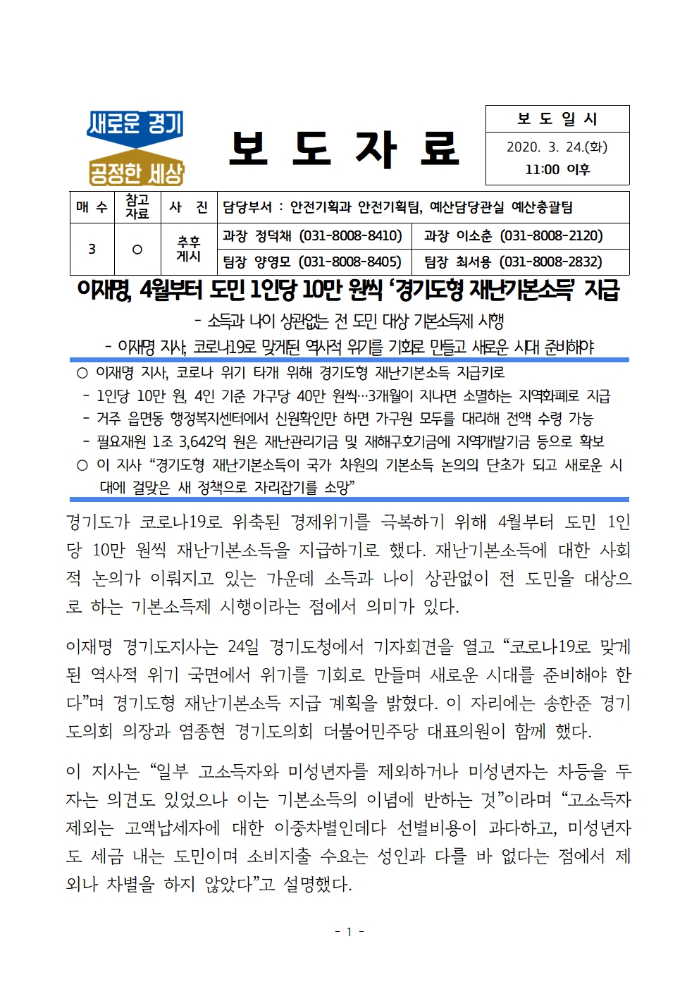 이재명 경기도지사는 24일 경기도청에서 기자회견을 열고 “코로나19로 맞게 된 역사적 위기 국면에서 위기를 기회로 만들며 새로운 시대를 준비해야 한다”며 경기도형 재난기본소득 지급 계획을 밝혔다. 이 자리에는 송한준 경기도의회 의장과 염종현 경기도의회 더불어민주당 대표의원이 함께 했다.