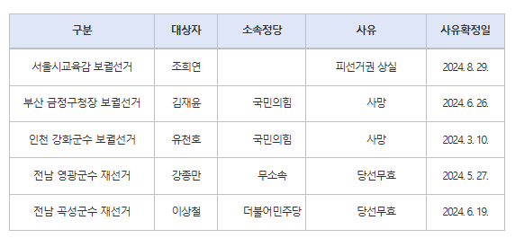 2024년 하반기 재·보궐선거(2024년 10월 16일) 전체메뉴열기 펼치기 D-14 2024. 10. 16(수)