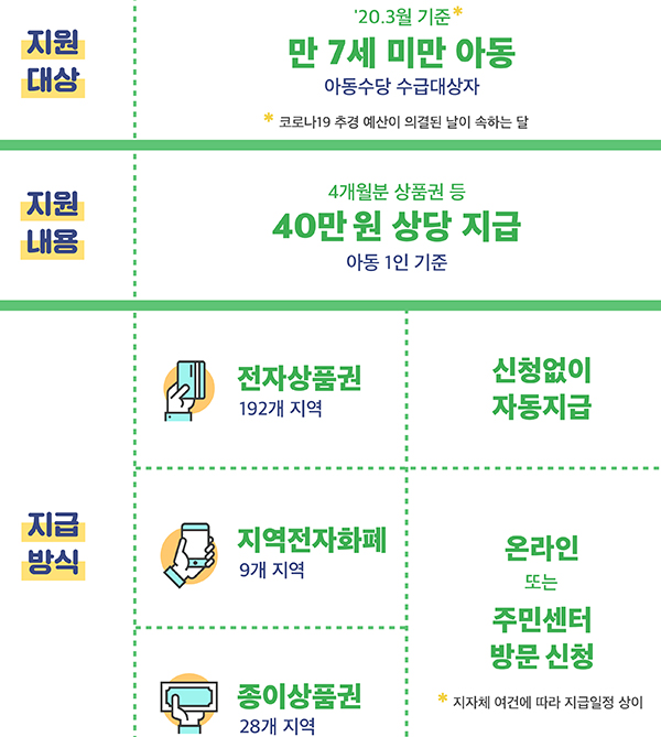 전자상품권이 지급되는 192개 시군구에 거주하는 대상자는 아동 1인당 40만 원 상당의 아동돌봄쿠폰이 현재 사용하고 있는 아이행복카드 또는 국민행복카드에 포인트 형태로 자동 지급된다.