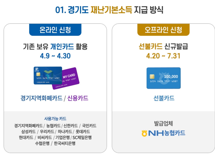 이에 따라 지역화폐카드나 신용카드 사용자는 경기도 재난기본소득 홈페이지에서 재난기본소득을 받고 싶은 자신의 카드 정보를 입력하면 된다. 신용카드는 하나, 우리, 국민, 신한, 삼성, 비씨, 롯데, 수협, 농협, 기업, 한국씨티, SC제일, 현대 등 13개 카드가 가능하다. 체크카드는 사용할 수 없다.