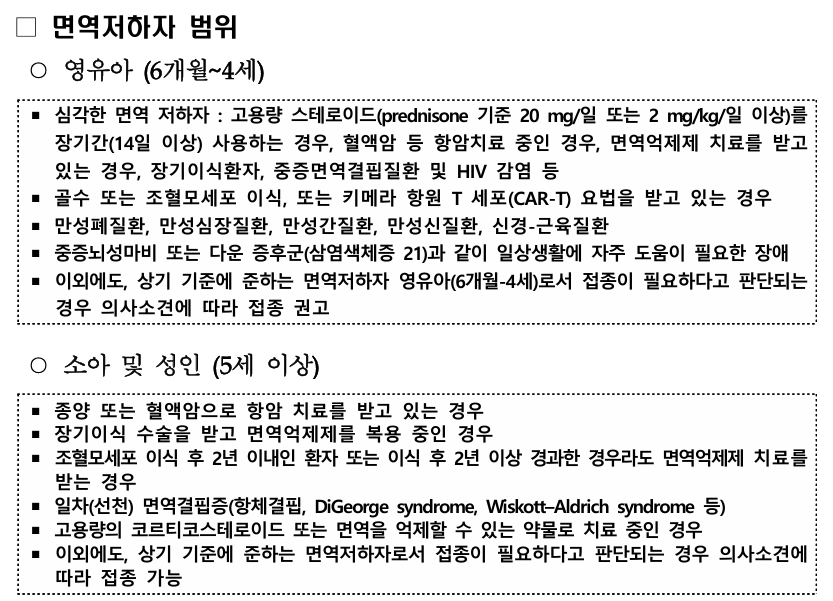 - 접종대상: 연령과 관계없이 생후 6개월 이상의 대상자 모두