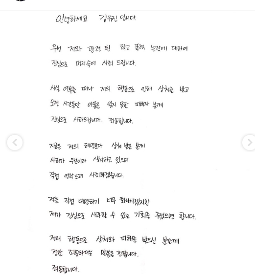 우선 저와 관련된 학교 폭력 논란에 대하여 진심으로 머리 숙여 사죄 드립니다.
