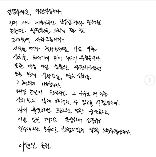 사실 여부를 떠나 저의 행동으로 인해 상처를 받고 오랜 시간 동안 아픔을 잊지 못한 피해자분께 진심으로 사과드립니다. 죄송합니다.