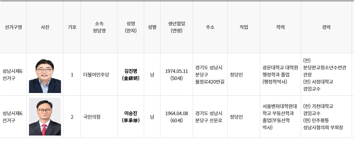 ◎ 성남시 분당구(성남제6선거구) 후보자 안내
