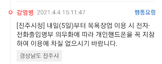 [진주시청] 내일(5일)부터 목욕장업 이용 시 전자·전화출입명부 의무화에 따라 개인핸드폰을 꼭 지참하여 이용에 차질 없으시기 바랍니다.